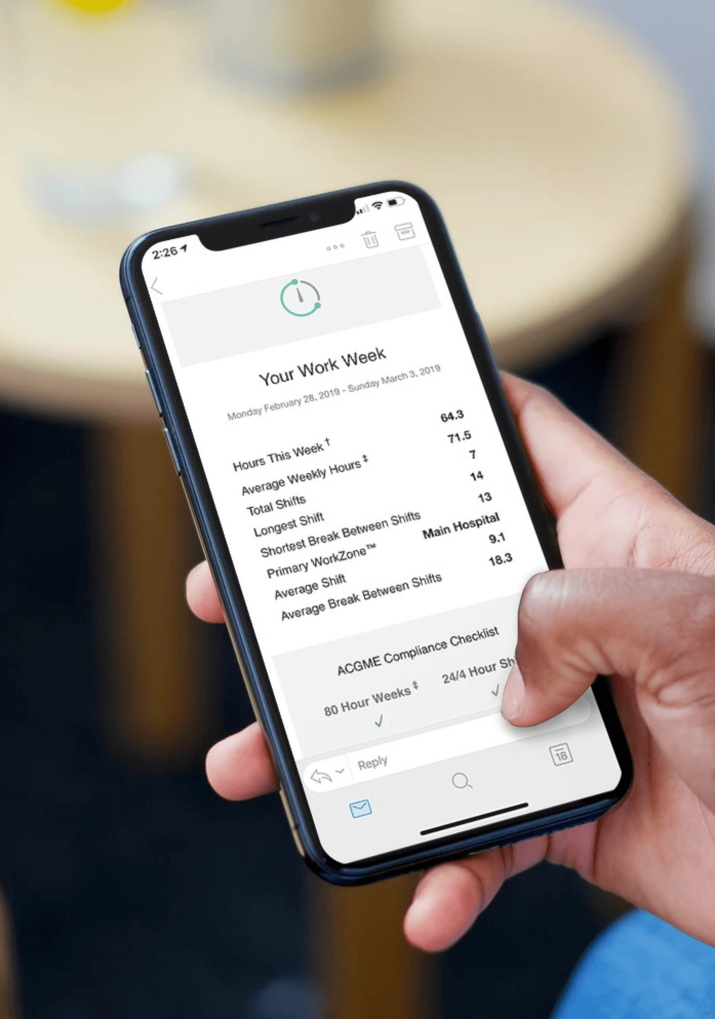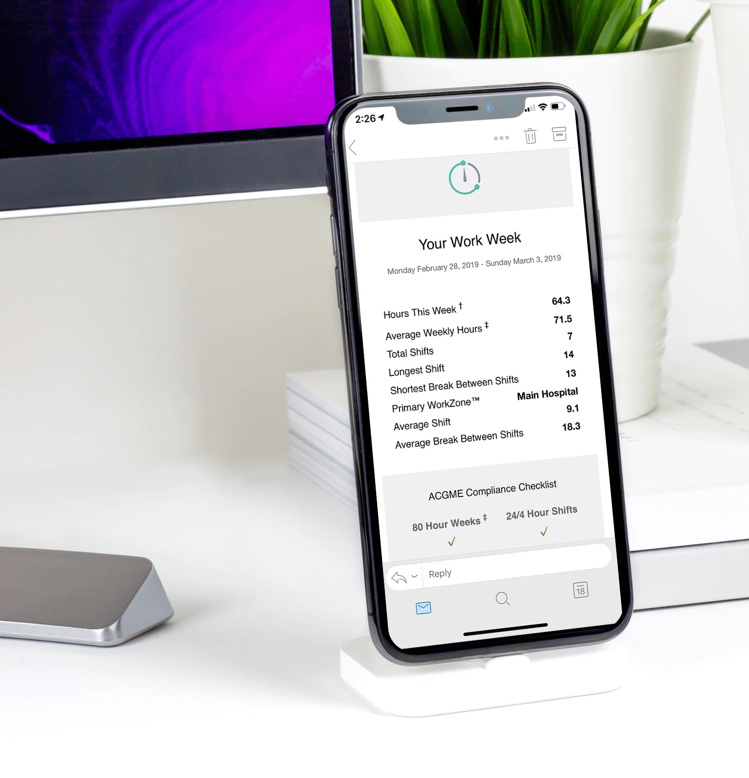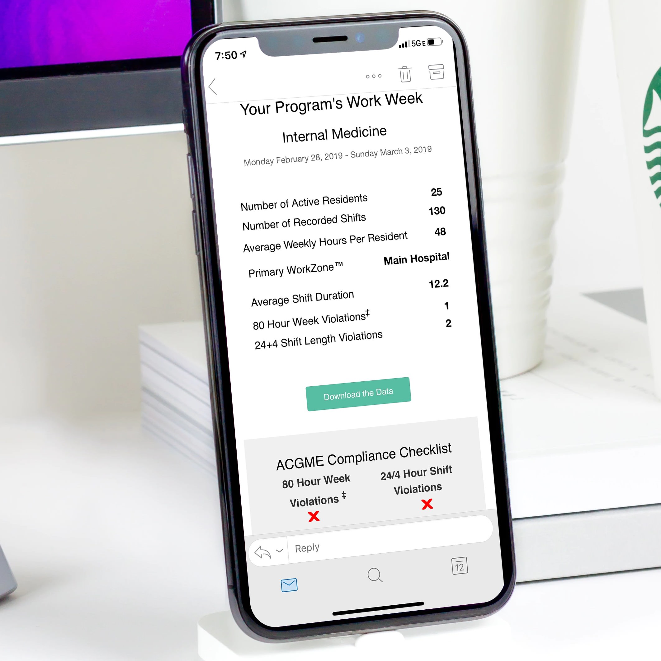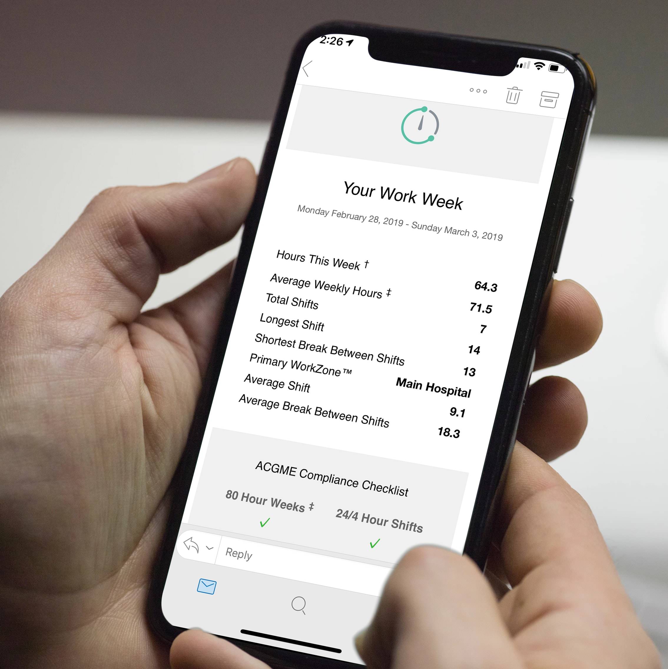Residents receive a summary of their weekly hours, a compliance checklist and their average weekly hours. The average weekly hours are calculated over the prior four weeks, which the ACGME uses to determine 80-hour work week violations.