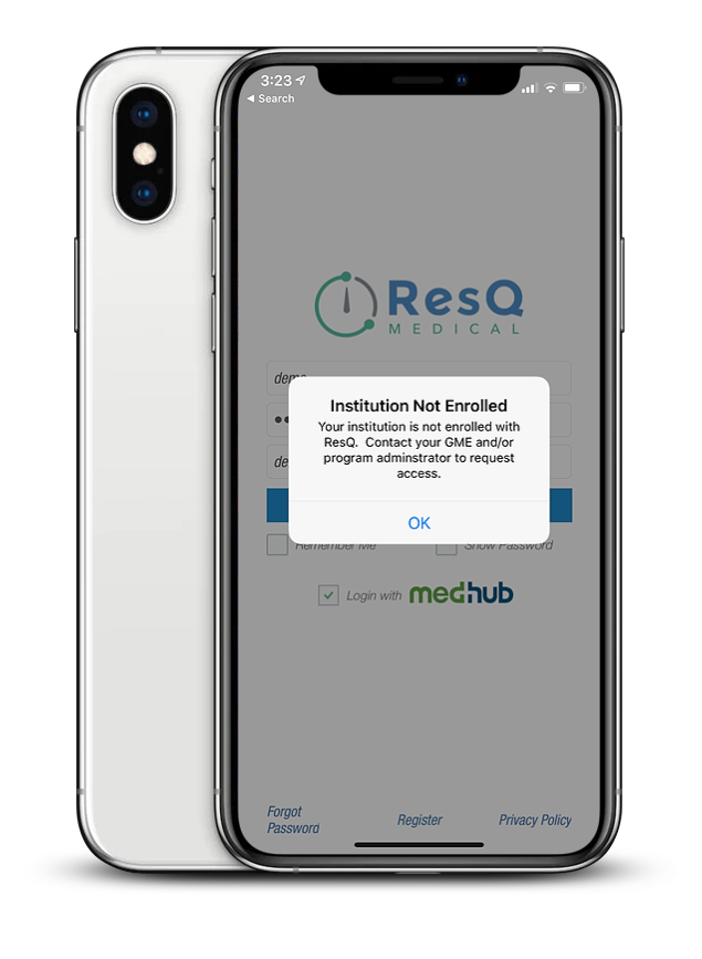 Trying to login to ResQ with MedHub credentials, but are unsure if your institution is enrolled? If you receive an error indicating your institution is not enrolled, reach out to your program or GME administrator to request access to use the ResQ app.