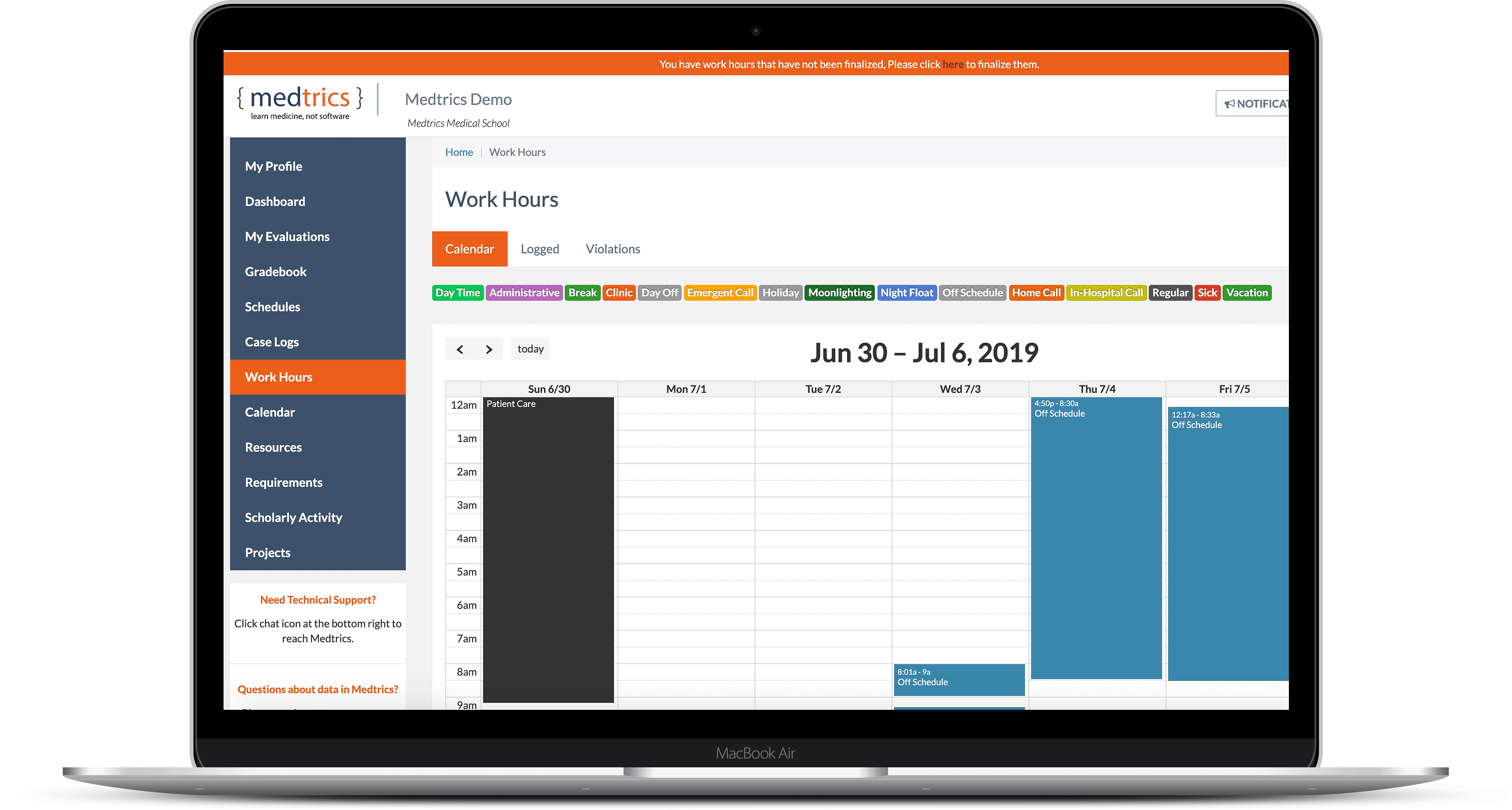 Reduce the administrative burden of handling resident work hours and increase your productivity level. Because work hours sync to Medtrics in real-time, administrators can mitigate issues and potential violations before they occur. Be confident with the reports presented to the ACGME during ACGME site visits.