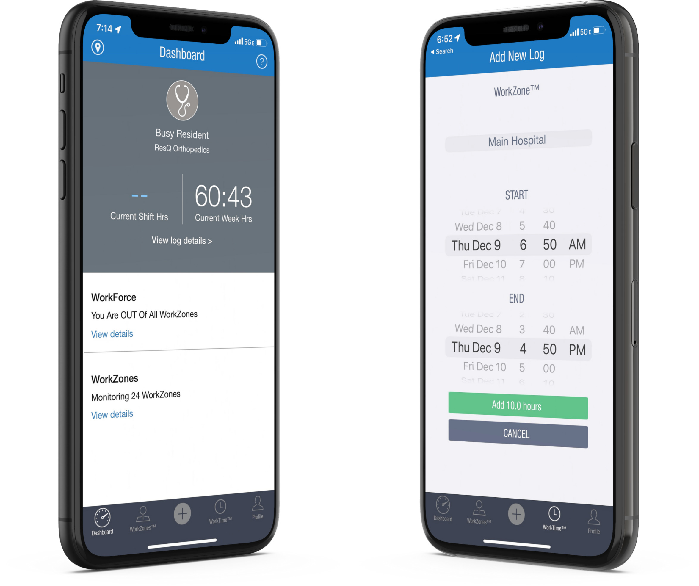 ResQ users may notice a slightly different look next time they open the app. The latest version of ResQ for iOS and Android now includes a “Quick Add” function. In the event that hours need to be added manually, the Quick Add function allows users to easily add a shift to the WorkTime Screen. The updated interface now displays a + icon at the bottom of the main screen. The + icon launches the Quick Add screen and allows users to select start time, end time and WorkZone name. As hours are selected, the interface automatically calculates and displays the length of the shift.