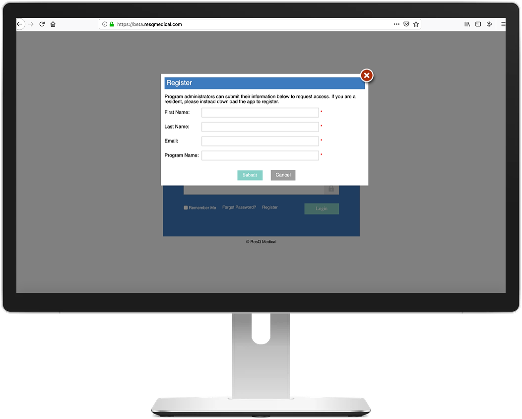 Register to receive Program Administrator credentials by visiting your institution’s ResQ server. Open a web browser and type the institution ID, followed by .resqmedical.com (i.e. lomalinda.resqmedical.com). Note: this part will need to occur from a computer since the institution’s server sites are not yet designed for mobile visits (we are working on this).