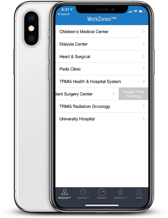 When the name of the WorkZone™ is swiped left, a “Toggle Time Tracking” button will appear on the right side of the WorkZone™. Clicking “Toggle Time Tracking” will turn off automatic recording of hours for that particular WorkZone™.