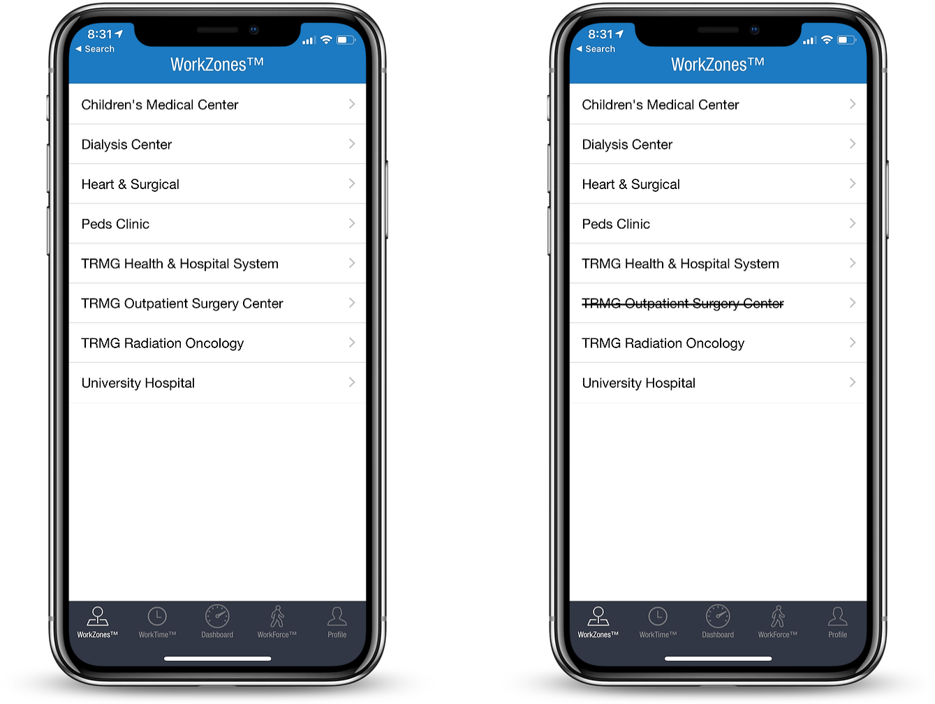 Once Toggle WorkZones™ is selected, a strike through will appear and work hours will never record upon entry to that specific WorkZone. If a resident ever has a need to automatically record work hours at that WorkZone™ again, they can simply swipe left a second time. The strikethrough will disappear and hours will once again record automatically for that WorkZone.™