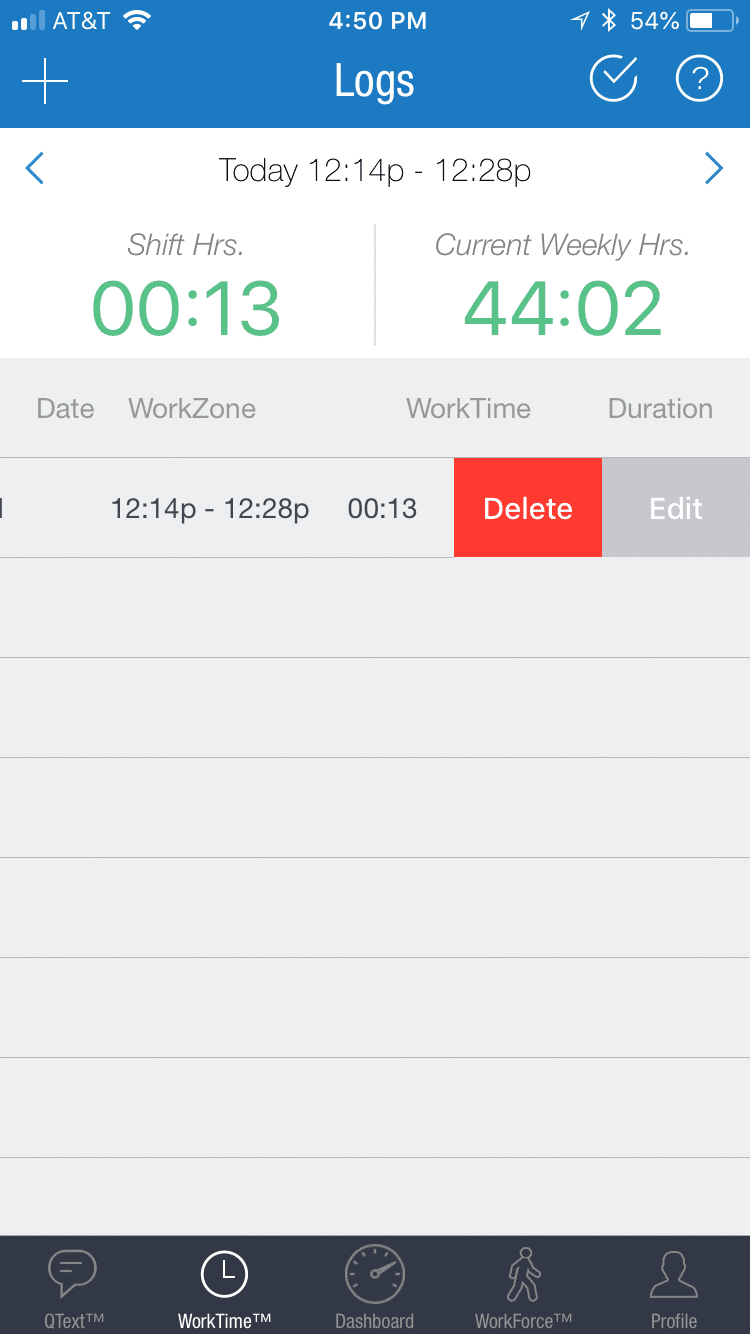 Once unlocked, swipe left to edit or delete or click the + icon to add a WorkTime™ log.
